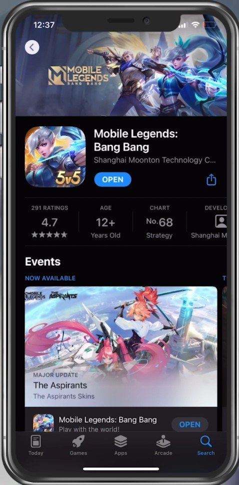 首先,我们将了解如何在 iPhone 或 iPad 上安装 Mobile Legends。打开你的应用商店应用。在搜索部分,查找 Mobile Legends。第一个应用程序应该是 Mobile Legends 官方应用程序。您可以点击得到从这里开始,该应用程序可以免费下载或点击图标仔细查看。
