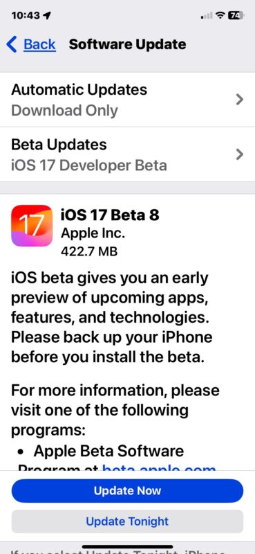 如果您已经在运行 Beta 版系统软件,则更新到 Beta 8 非常简单: