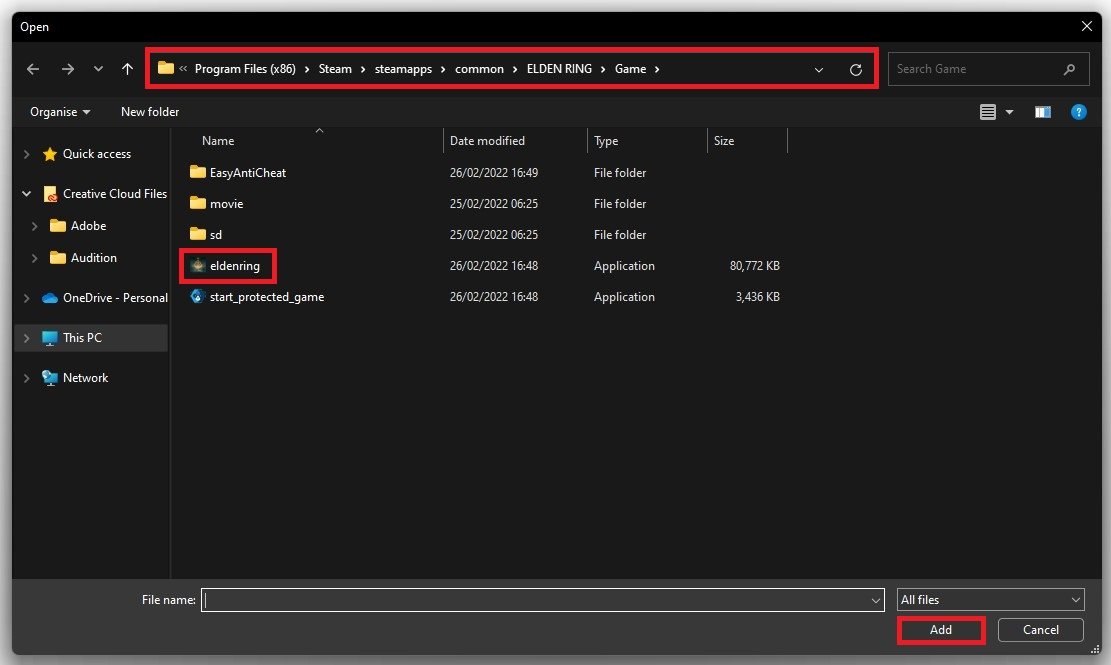在你的文件浏览器,导航到您保存游戏的驱动器。 Steam版本的文件路径为:程序文件>蒸汽>蒸汽应用程序>常见的>埃尔登之环>游戏并在这里选择埃尔登灵。