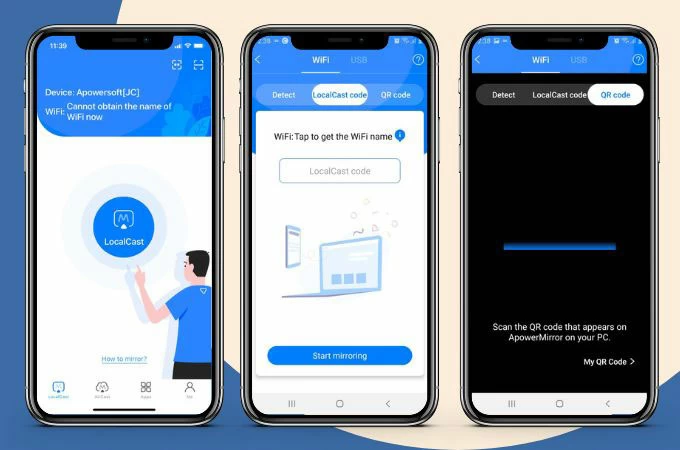 - 在手机上打开ApowerMirror,点击“本地投射”按钮搜索可用的设备。