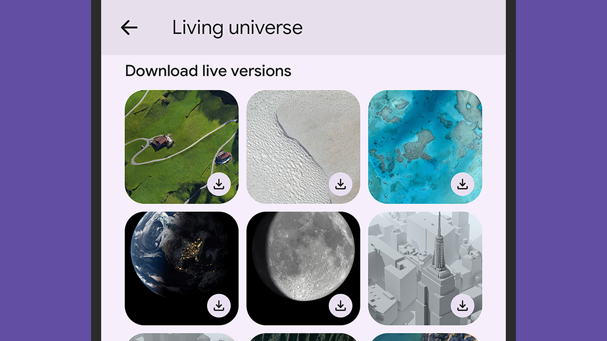 这我的照片选项相当简单,使您能够选择手机上存储的图像。您还会看到 Google 提供的精选图片集,涵盖以下类别:艺术,风景, 和纹理。这活绽放和生命宇宙选择更有趣一些,因为它们带有附加的运动效果,例如短视频剪辑。