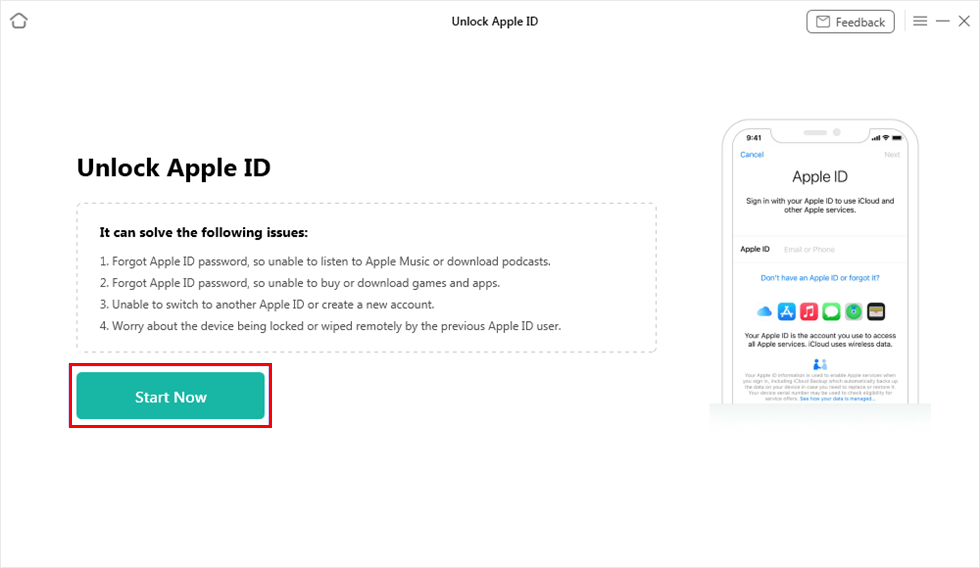 步骤 2. 启动它并从主屏幕中选择“解锁 Apple ID”。