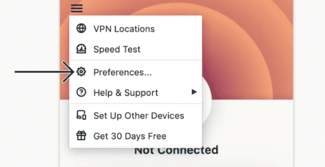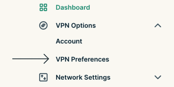 - 导航至设置菜单。选择 ”VPN 选项“ 然后 ”VPN 首选项”。