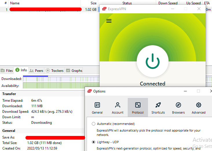 是的!Lightway 可用于种子下载。 UDP 和 TCP 协议都能产生良好的种子下载结果,并且这两个选项都允许我下载20 分钟内处理 1.02 GB 文件(考虑到我当时使用的是 10MB 线路,这是一个非常好的时机)。