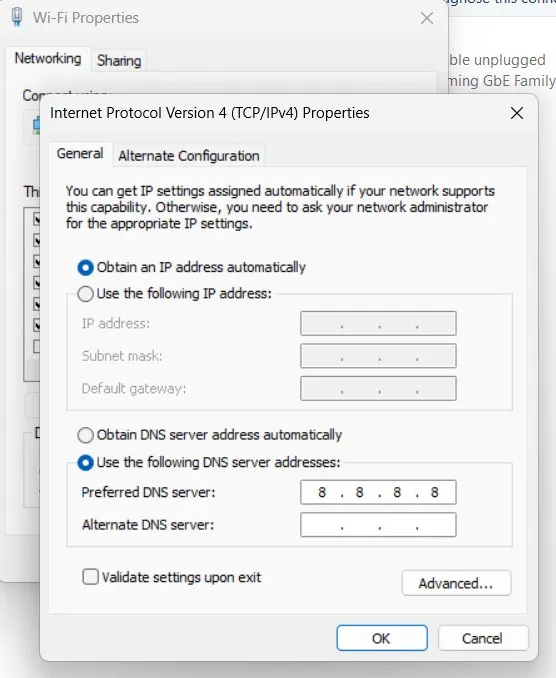 7. 单击“使用以下 DNS 服务器地址”旁边的单选按钮,然后键入以下数字以使用 Google DNS 服务器。