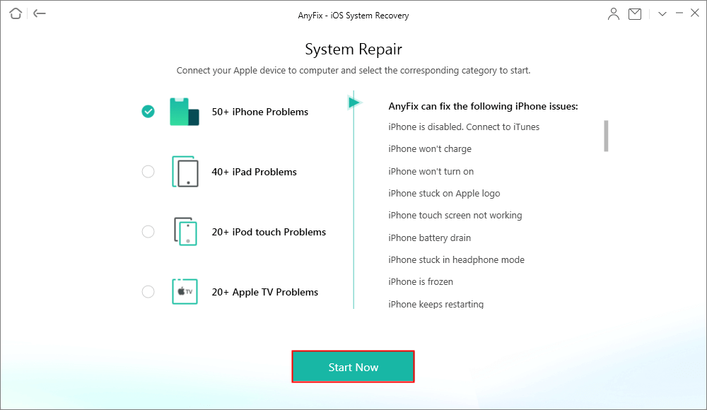 第 2 步:选择50 多个 iPhone 问题选项并按现在开始按钮。