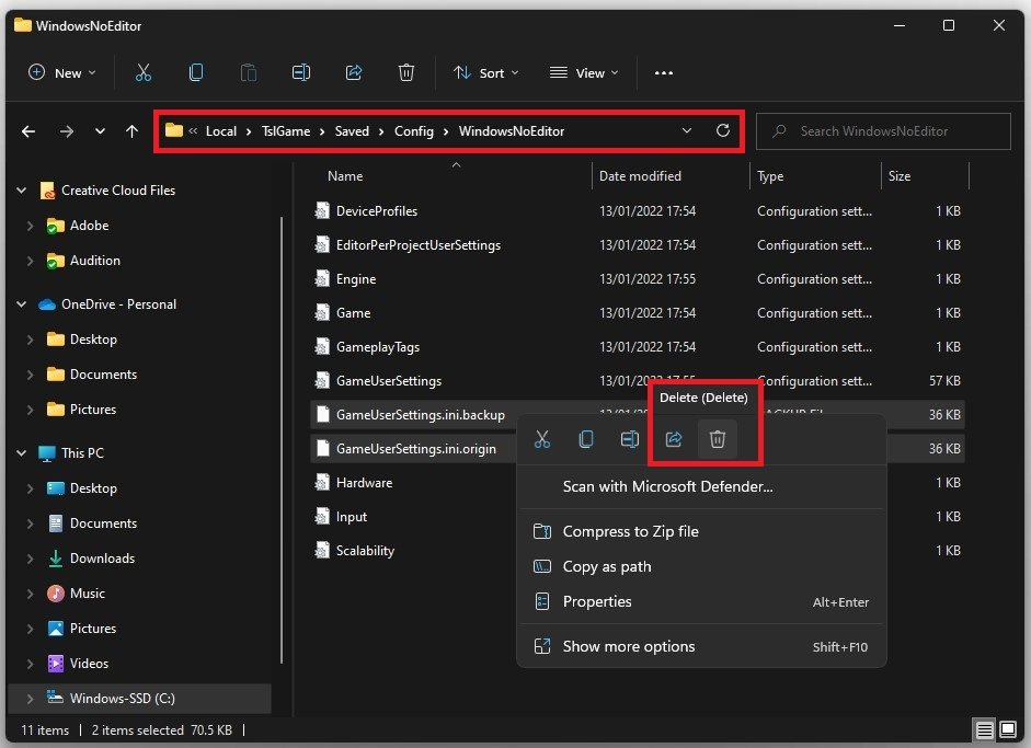 确保 PUBG 没有在后台运行。搜索%应用程序数据%在开始菜单中搜索并按 Enter 键。将打开一个新文件夹。导航至:AppData > Local > TslGame > Saved > Config > WindowsNoEditor 删除游戏用户设置.ini文件。