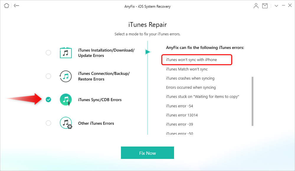 步骤 2. 选择 iTunes 同步/CDB 错误并继续。