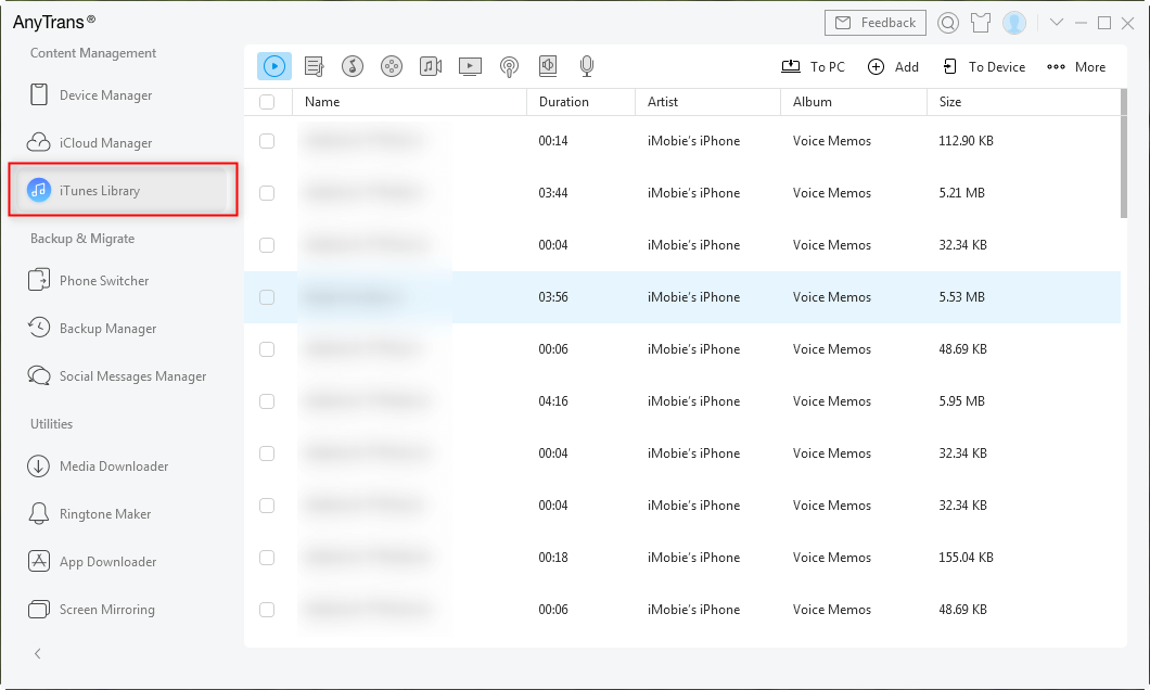 步骤 1. 在计算机上安装 AnyTrans,运行它,然后将 iPhone 或 iPad 连接到计算机 > 单击左侧菜单,选择 iTunes Library。