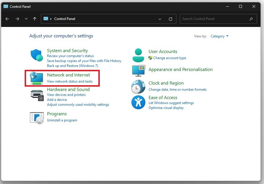 如果连接平台错误仍然存在,我们将不得不更改您的 DNS 服务器地址,因为问题很可能与您的网络连接有关。打开你的控制面板通过在开始菜单搜索中搜索它。确保查看方式:类别,然后单击网络和互联网。