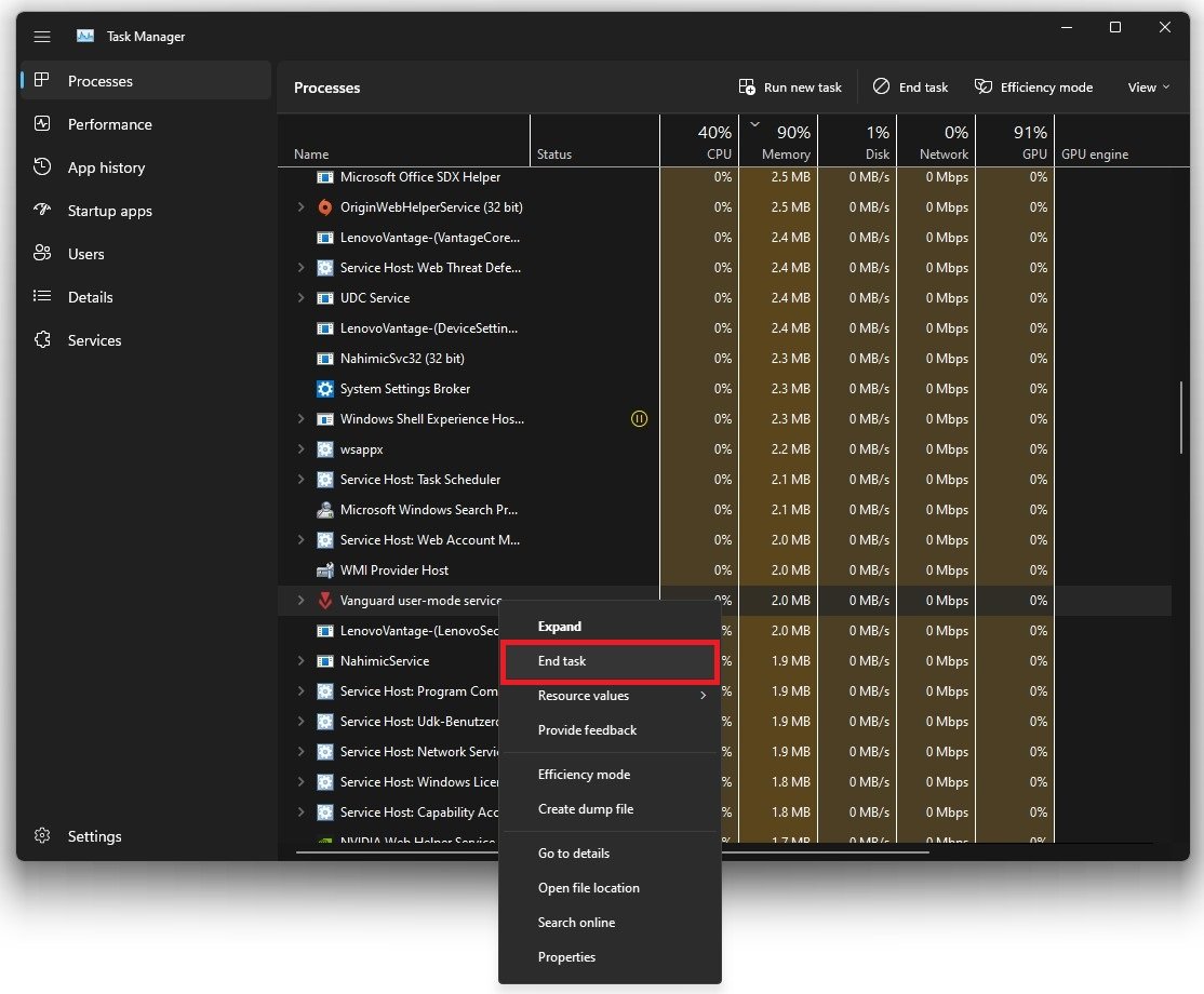 关闭所有可能仍在系统上运行的 Riot 和 Valorant 进程。在你的任务管理器,右键单击其中的每个进程流程选项卡并选择结束任务。