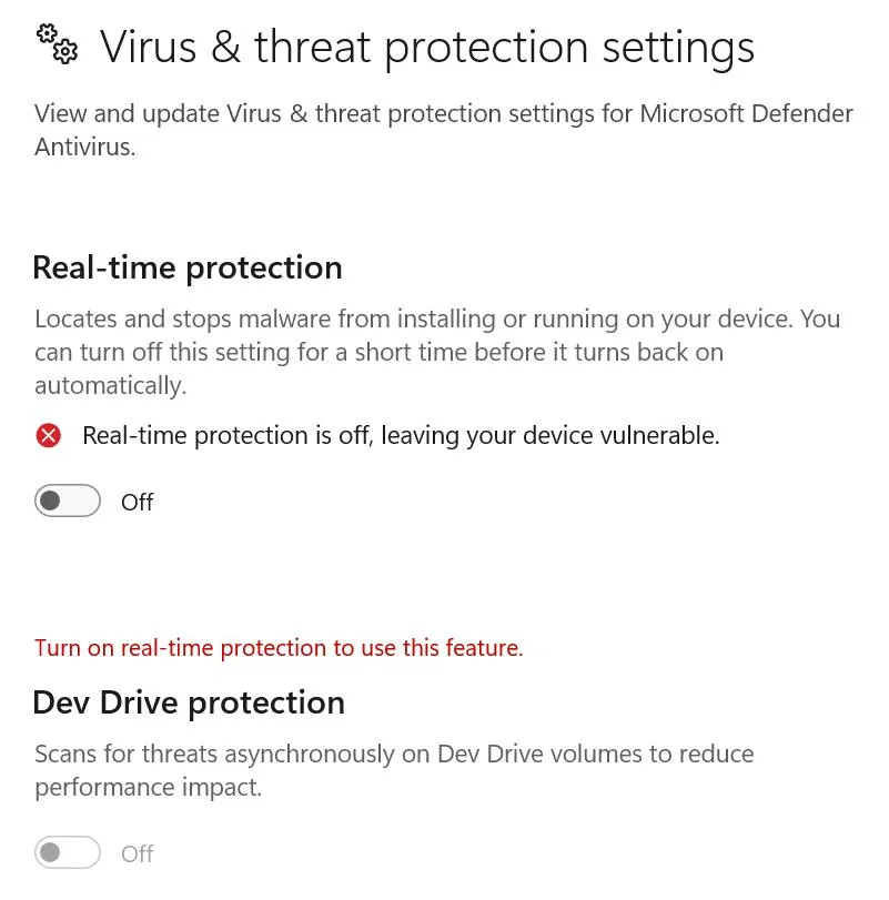 - 将“实时保护”下的切换按钮向左滑动以将其禁用。