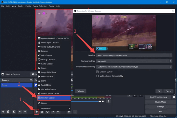步骤1。在计算机上打开 OBS Studio。在“场景”面板中,右键单击并选择“添加”>“窗口捕获”。选择与镜像手机屏幕对应的窗口,在本例中为 AnyMiro 窗口。