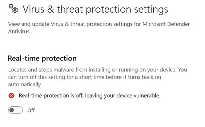 - 将“实时保护”下的切换按钮向左滑动以将其禁用。