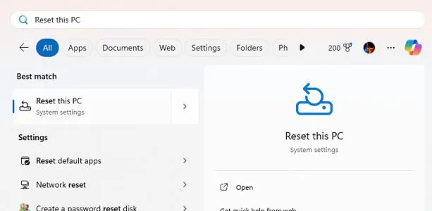 - 打开“开始”菜单并搜索“重置此电脑”。然后,从搜索结果中选择适当的选项。