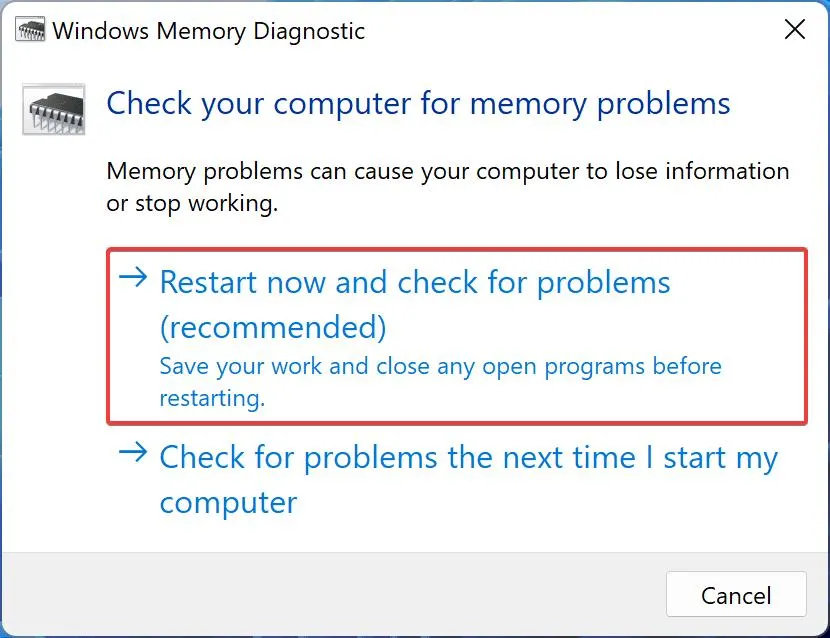 笔记– 您可以通过按 Win + R,输入 mdsched.exe,然后单击“确定”按钮来启动此工具。
