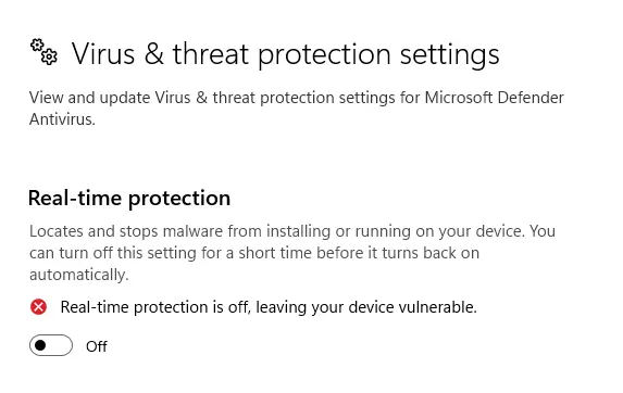 5. 将实时保护下的切换按钮向左滑动以将其禁用。