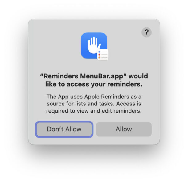 当你第一次打开提醒菜单栏时,你需要经历越来越像 Windows 的权限屏幕,首先授予它打开的权限,然后授予它对你的提醒的权限。完成后,菜单栏图标就已添加,并且可以从 Mac 上的任何位置轻松使用它。