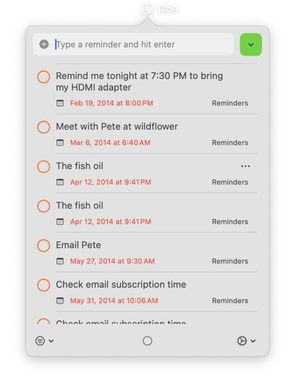 我使用“提醒菜单栏”应用程序时遇到的主要问题是,您无法按日期反向排序,从而可以更轻松地查看已添加的最新提醒。相反,我看到了数百个古老的提醒 - 尽管已多次被标记为已完成,但它们仍然保留在提醒应用程序中 - 但需要明确的是,这实际上是提醒本身的长期问题,而不是提醒菜单栏实用程序。