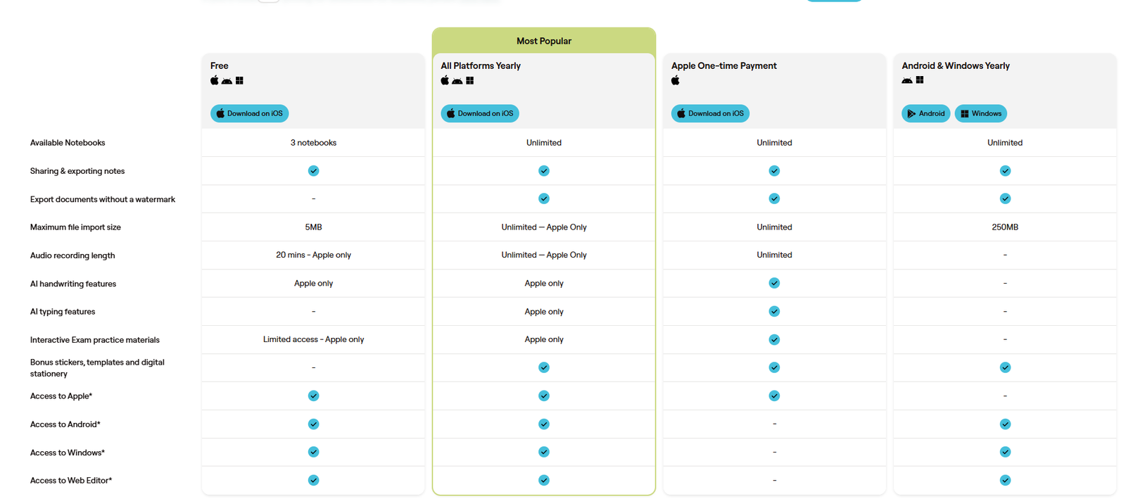 Notability提供三个级别:入门级(免费)、Plus(20 美元/年)和 Pro(99 美元/年)。