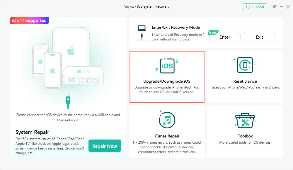 第 1 步:在 Windows 或 Mac 计算机上下载并启动 AnyFix > 然后选择更新/降级 iOS。