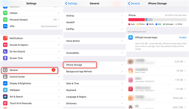方法 4. 检查 iPhone/iPad 上的可用空间
