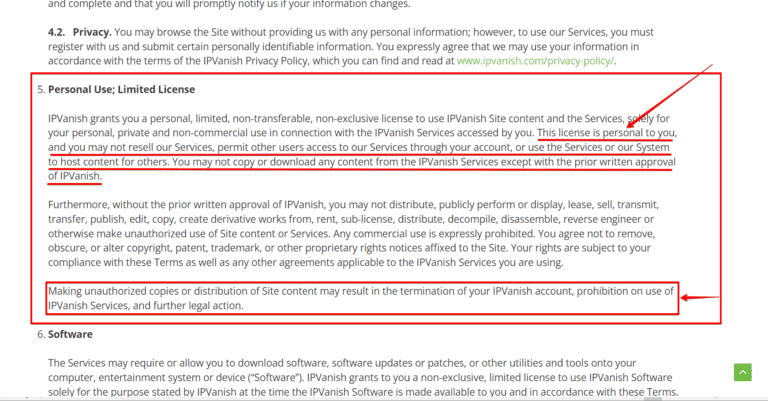 它进一步澄清您的 IPVanish 帐户是您个人的以及“您不能通过您的帐户转售或允许他人使用我们的服务。”