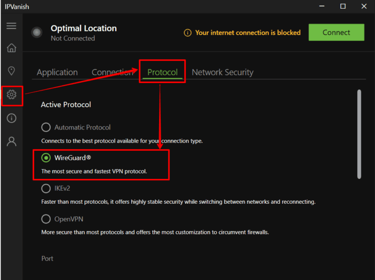 - 选择合适的协议。我建议使用线卫,因为它是最安全、最快速的协议。通过访问它设置>协议>线卫。