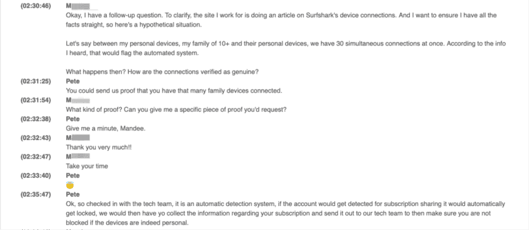 为了全面了解情况,我与 Surfshark 的客户支持代表 Pete 进行了交谈,并问道:“如果我想同时连接 50 个设备怎么办?“