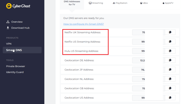 CyberGhost 甚至在英国和美国拥有智能 DNS 地址