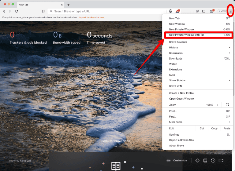 - 点击 ”带有 Tor 的新私人窗口”。