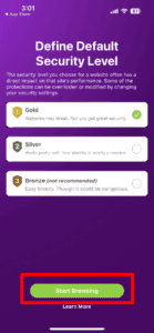 - 在您的 iOS 设备上,等待连接,单击“下一个,”然后选择您的安全级别配置(金级、银级、铜级)。