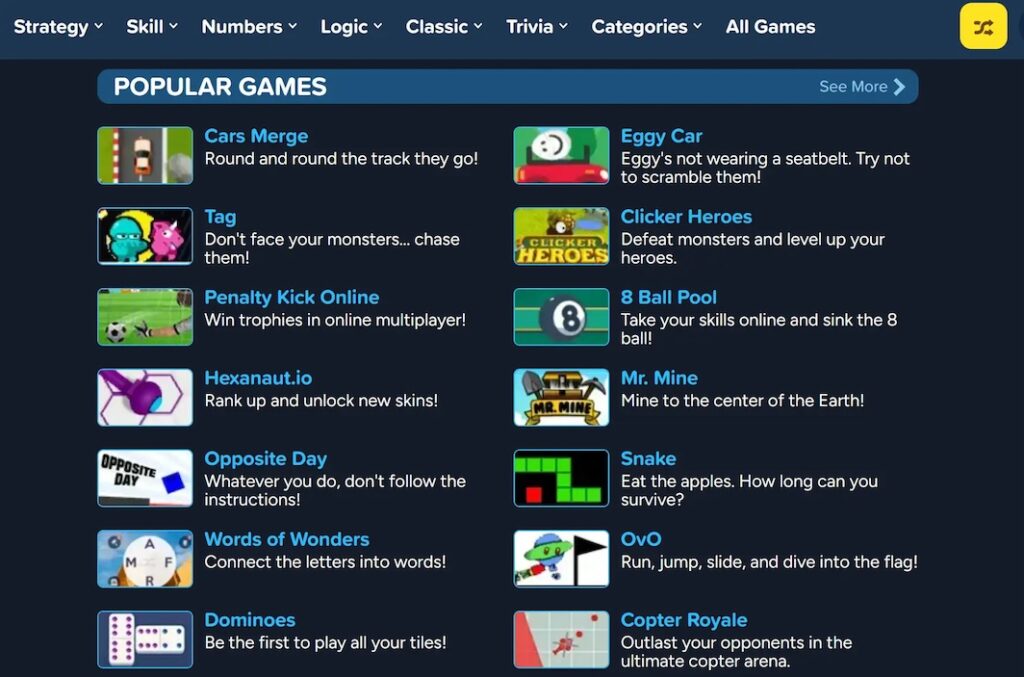 酷数学游戏在畅通游戏领域被列为值得信赖的品牌。该网站将教育与娱乐结合在一起,其程度是大多数管理员可以接受的,同时又不牺牲乐趣。
