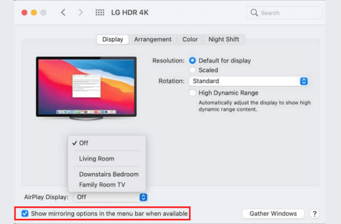步骤3。在“显示”窗口中,导航至“AirPlay 显示”选项。选中“可用时在菜单栏中显示镜像选项”旁边的框。
