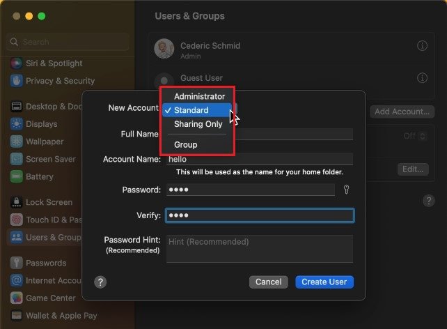 点击添加账户输入管理员密码后创建一个新用户。然后,您可以选择创建标准帐户或第二个管理员帐户。当将此设置为仅供分享,用户对您的 Mac 的访问权限将受到限制。您将能够指定仅共享帐户有权访问哪些文件和文件夹。
