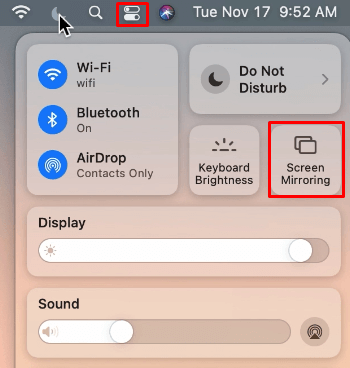 如果您有一台 MacBookmacOS 蒙特利 12 或更高版本,打开控制中心从菜单栏中单击屏幕镜像图标。
