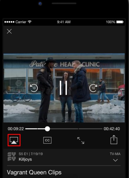- 您应选择击中任何 SYFY 的视频。位于屏幕右上角并启用它。隔空播放图标你的电视名称