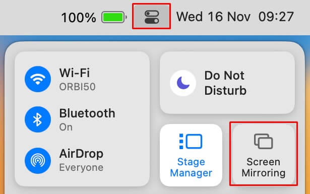 Mac 上的图标。从下拉选项中,点击屏幕镜像选项。