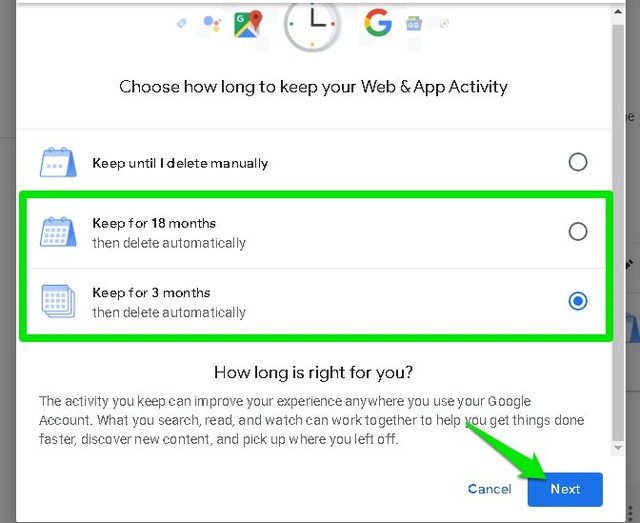 有两个时间段可以选择,将数据保存18个月或3个月。做出选择并击中“下一个”。