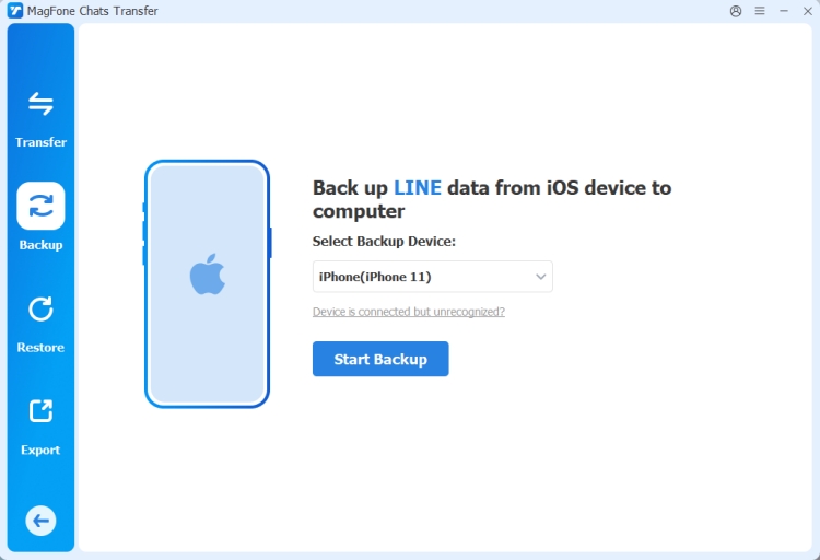 将 iPhone 连接到电脑,然后单击备份左侧菜单框中的选项。您的设备信息将被检测。然后点击开始备份备份您的 LINE 聊天记录。