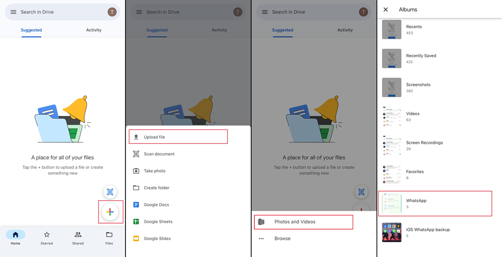 步骤 5。在相册中找到 WhatsApp 文件,然后选择要备份到 Google 云端硬盘的媒体。轻敲上传备份。