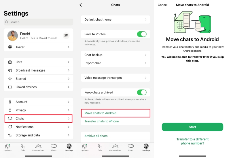 对于换用 Android 设备并希望将 WhatsApp 数据完全备份到 Google Drive 的用户来说,使用 WhatsApp 内置的传输功能是一个可行的选择。这意味着将 iPhone 上的 WhatsApp 数据传输到 Android 设备,然后将 WhatsApp 备份到 Google Drive。