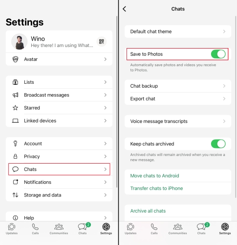 步骤2。打开保存到照片这样您的 WhatsApp 照片和视频就会自动保存到“照片”中。