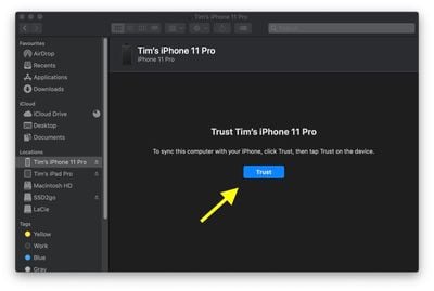 - 如果这是第一次将您的设备连接到 Mac,请单击相信在 Finder 窗口中。