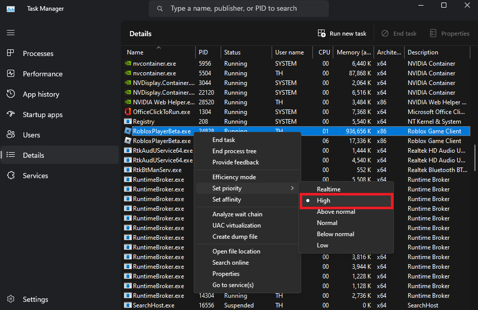 任务管理器 > 详细信息 > RobloxPlayerBeta.exe > 设置优先级 > 高