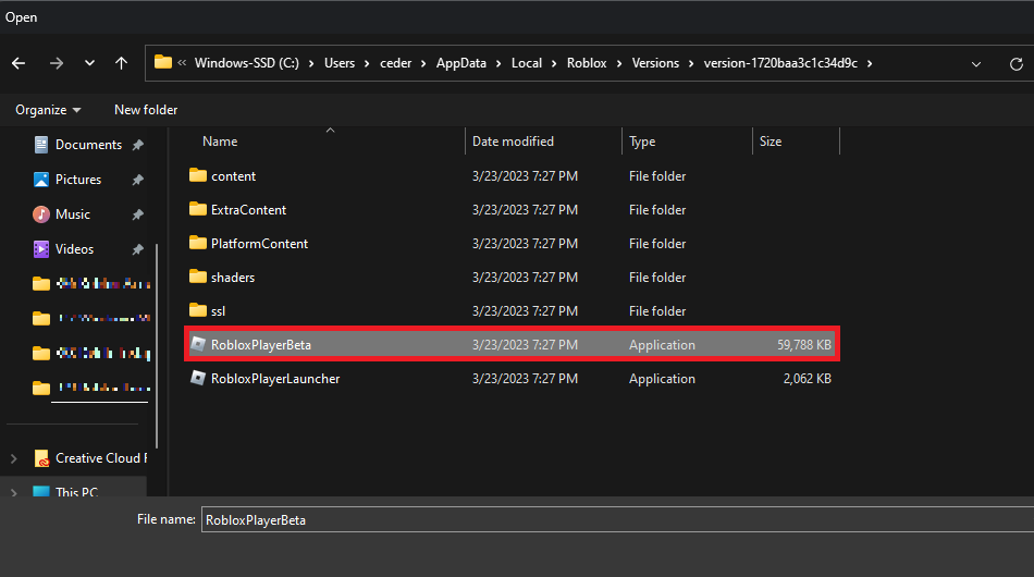 Roblox 的默认安装位置位于程序文件 > Roblox > 版本中。选择此列表中的最新文件夹,然后单击 RobloxPlayerBeta,然后将其添加到应用程序列表中。