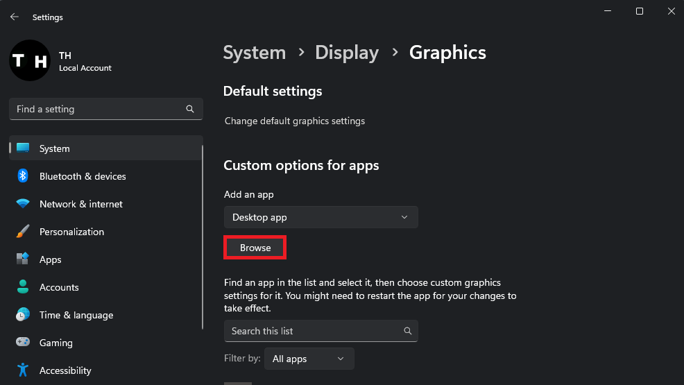 在相关设置下,单击图形。当应用程序和游戏在 PC 上运行时,您可以为其指定图形首选项。要添加 Roblox,请单击“浏览”打开文件资源管理器。