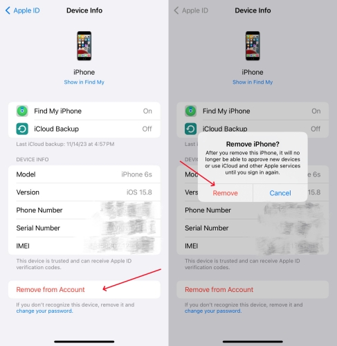 步骤 3.选择您锁定的 iPhone,然后点击从帐户中删除,然后点击消除确认。