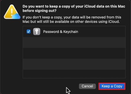 单击“注销”,系统可能会提示您是否要在注销之前在 Mac 上保留 iCloud 数据的副本。选择您想要保留副本的应用程序并选择保留一份副本。接下来,您将需要输入您的 Apple ID 密码。