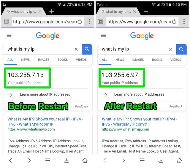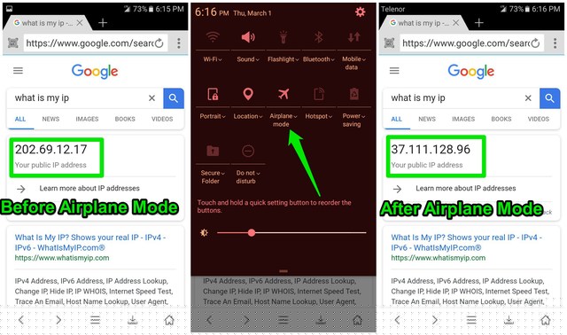 如果您使用移动数据,则运营商提供的 IP 地址也可以更改。为此,请打开飞行模式从通知面板(从顶部向下滑动)并等待 1-2 分钟。现在将其关闭并更改 IP 地址。或者,您也可以使用这个名为“IP 地址更改器”的应用程序它基本上做同样的事情,但也保留 IP 地址的历史记录。